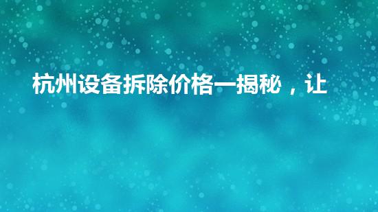 杭州设备拆除价格一直是热门话题,让很多人不知道如何选择,因此本文从专业角度出发,分析了杭州设备拆除价格背后的一些因素,包括市场行情、服务质量、设备种类、技术手段等方面,旨在让读者了解杭州设备拆除价格的真相,以便更好地选择合适的服务商。