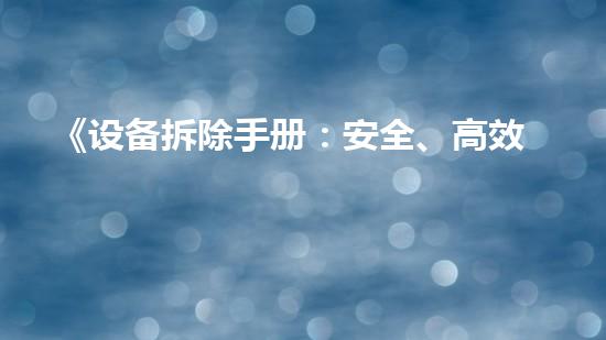 《设备拆除手册:安全、高效、便捷》是一本介绍设备拆除的专业手册,主要围绕着如何在拆除设备时保证安全、提高效率、降低成本等方面展开讨论。本文将从几个方面对这本手册进行深入分析,包括设备拆除的必要性、拆除前的准备工作、拆除过程中的注意事项、设备拆除中的技术和工具、拆除后的清理工作、以及设备拆除在环保领域中的意义等。通过本文的解读,读者可以更深入地了解设备拆除的各个环节,掌握拆除技术和实践经验,提升工作效能和安全性。