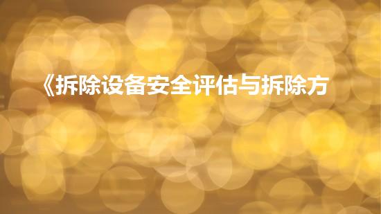 本文主要介绍了《拆除设备安全评估与拆除方案制定报告》的相关内容,探讨了设备拆除的背景、安全评估的方法和拆除方案的制定步骤。同时,介绍了巴洛仕集团的不动火拆除技术的应用,并对化工拆除的未来发展提出了建议。化工拆除行业在安全、环保和技术水平方面的不断提高,将会为行业发展和社会贡献提供有力支持。