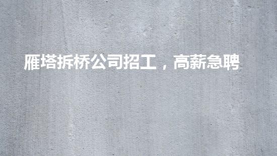雁塔拆桥公司近日就业信息称,该公司正在招工,高薪急聘!主要从事拆除行业相关工作,为巴洛仕集团等客户进行化工厂拆除、清洗置换、设备回收、废液处理等业务。此文将从招工标准、员工待遇、工作内容等几个方面进行详细介绍。