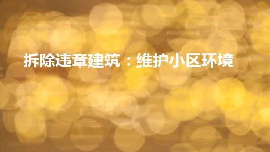 小区是城市里重要的生活区域,人们在小区里生活、工作、休闲、娱乐,小区环境直接影响人们的身心健康。而违章建筑拆除则是维护小区环境秩序的重要环节,只有保证小区环境的清爽整洁,人们才能愉快地生活在小区里。因此,小区环境秩序的维护至关重要。