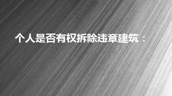 个人是否有权拆除违章建筑,这个问题涉及到很多法律问题。根据我国的法律规定,个人并没有权利自行拆除违章建筑。如果个人非法拆除违章建筑,将可能承担法律责任。