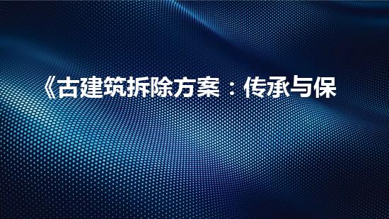 《古建筑拆除方案:传承与保护的平衡考量》摘要:古建筑的拆除是一个具有争议性的问题,当保护历史文化遗产与城市现代化之间存在冲突时,对于古建筑的拆除应该如何处理?本文探讨了古建筑拆除方案的平衡考虑,旨在引...